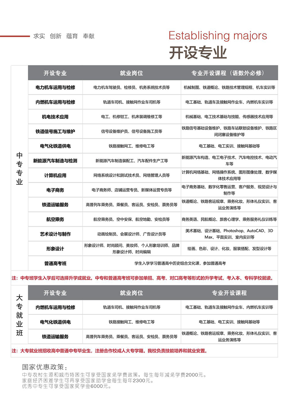 铁路类的电力机车运用与检修、内燃机车运用与检修、机电技术应用、铁道信号施工与维护、工业机器人技术应用、电气化铁道供电、新能孺源汽车制造与检测、计算机应用、电子商务、铁道运输服务、航空乘务、艺术设计与制作、幼儿保育(原学前教育)、形象设计